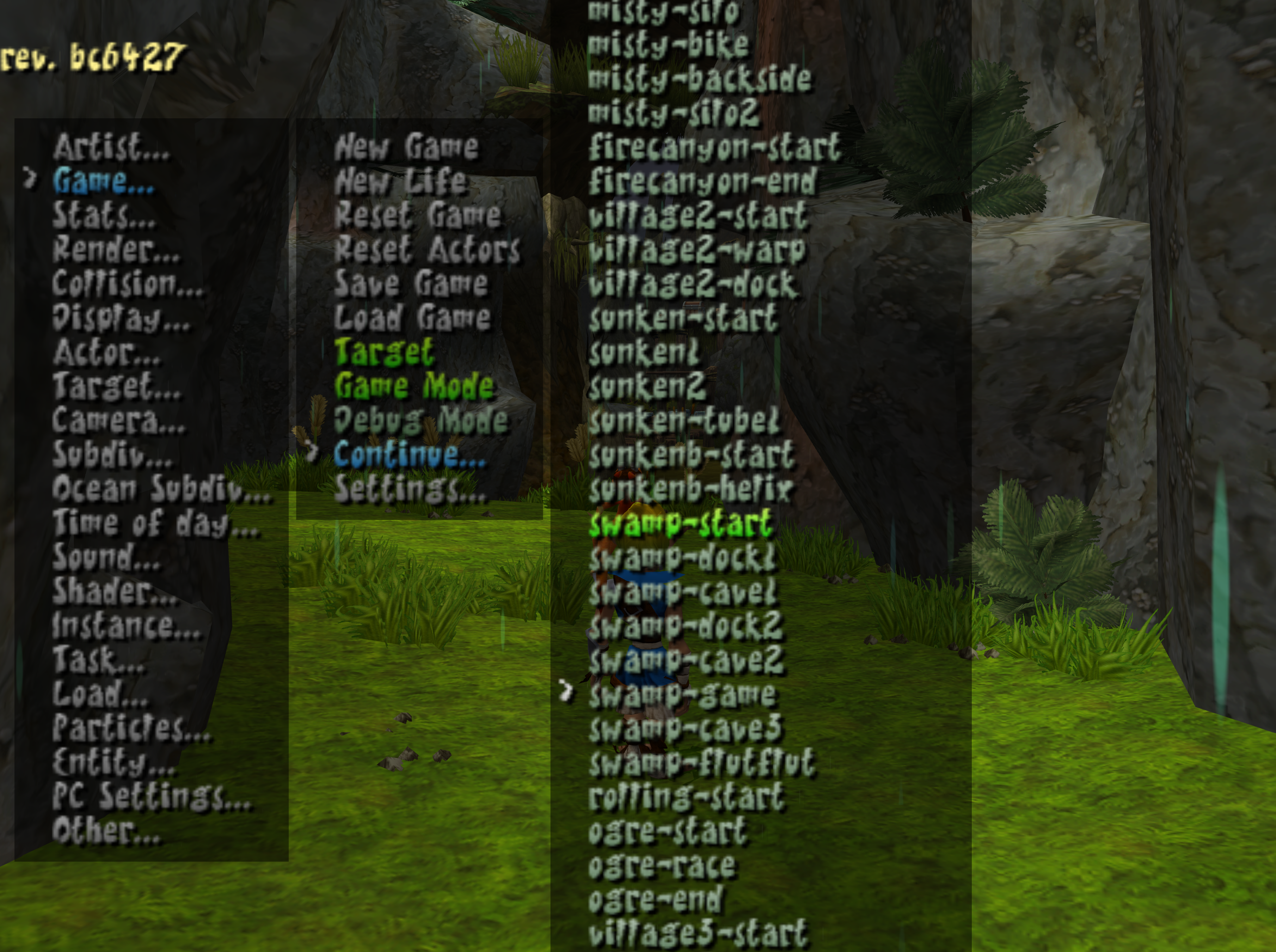 From here the code uses a similar while loop to go through all the continue-points in each level, and adds a new debug menu item for each one. I'll gloss over the details of the debug menu itself, but the important takeaway is that when one of these options is selected, it will run the dm-current-continue function and pass the name of the continue-point as an argument.